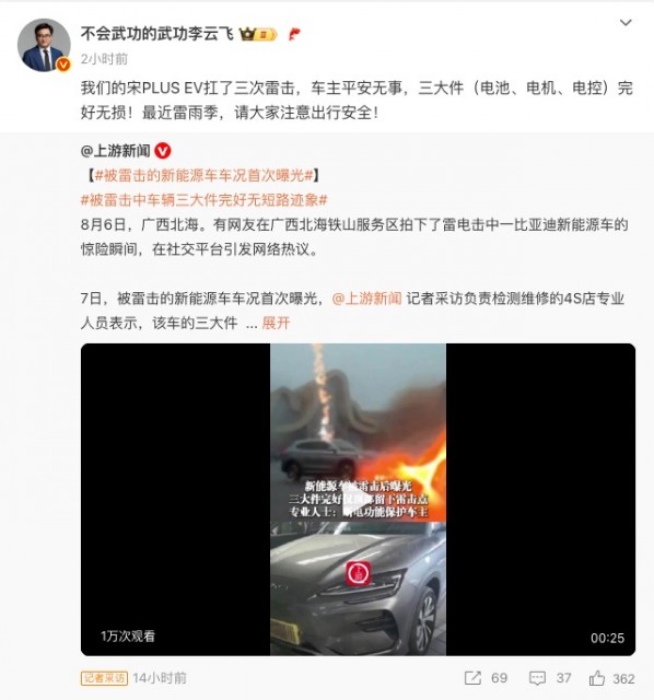 比亚迪品牌及公关处总经理李云飞今日在微博表示,该车辆遭多次雷击后安然无恙,车主平安无事,三电系统完好无损。