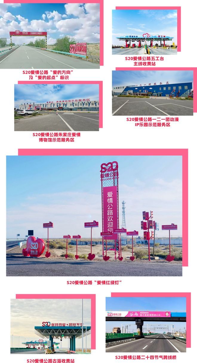 S20爱情公路,是全疆首个人文主题高速公路,作为新疆交投集团自主建设和运营的第一条高速公路项目,是新疆“6横6纵7枢纽8通道”高等级公路网中的第二横,也是由中国内地通往中亚地区的重要内陆通道,在自治区高速公路网中占据重要地位。为赋能“新高速·天山行·雪莲情”服务品牌再添新活力,新疆交投集团克拉玛依分公司结合S20沿线特色,旨在打造全疆首条文化型高速公路,描绘一幅“诗与远方”的长路画卷。以“爱”为名,连接彼此,这条公路汇集了一段段动人心弦的爱情故事,沿途设置了“爱的方向”指引幸福历程、“爱的起点”开启浪漫旅行、“爱的跨线桥”展现24节气爱情宣言、“爱情博物馆示范服务区”留下爱的印记、“动漫IP乐园示范服务区”追寻童趣时光、“爱的红绿灯”转角遇见爱……保持热爱 奔赴山海,为每一位乘客开启一段浪漫的旅行体验,一路在中华传统文化与浪漫爱情氛围中穿越山海,奔赴美好。